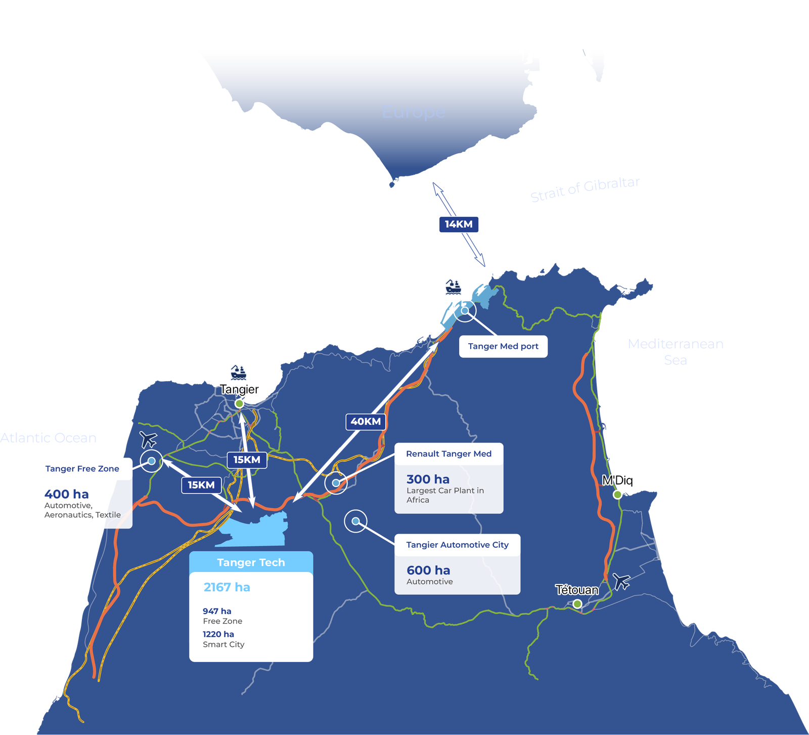- Tanger Tech Mohammed VI City, managed by SATT, is a massive project in Aïn Dalia, Tangier, covering 2,167 hectares. It includes an industrial park spanning 947 hectares and a smart city over 1,220 hectares, attracting diverse industries. Strategically located, Tanger Tech offers robust support and seamless connectivity, being 15 km from Tangier International Airport, Tangier High-Speed Rail Station, and the city center, and 40 km from the Tanger Med port. This innovation hub aims to create jobs and supports sustainable development.